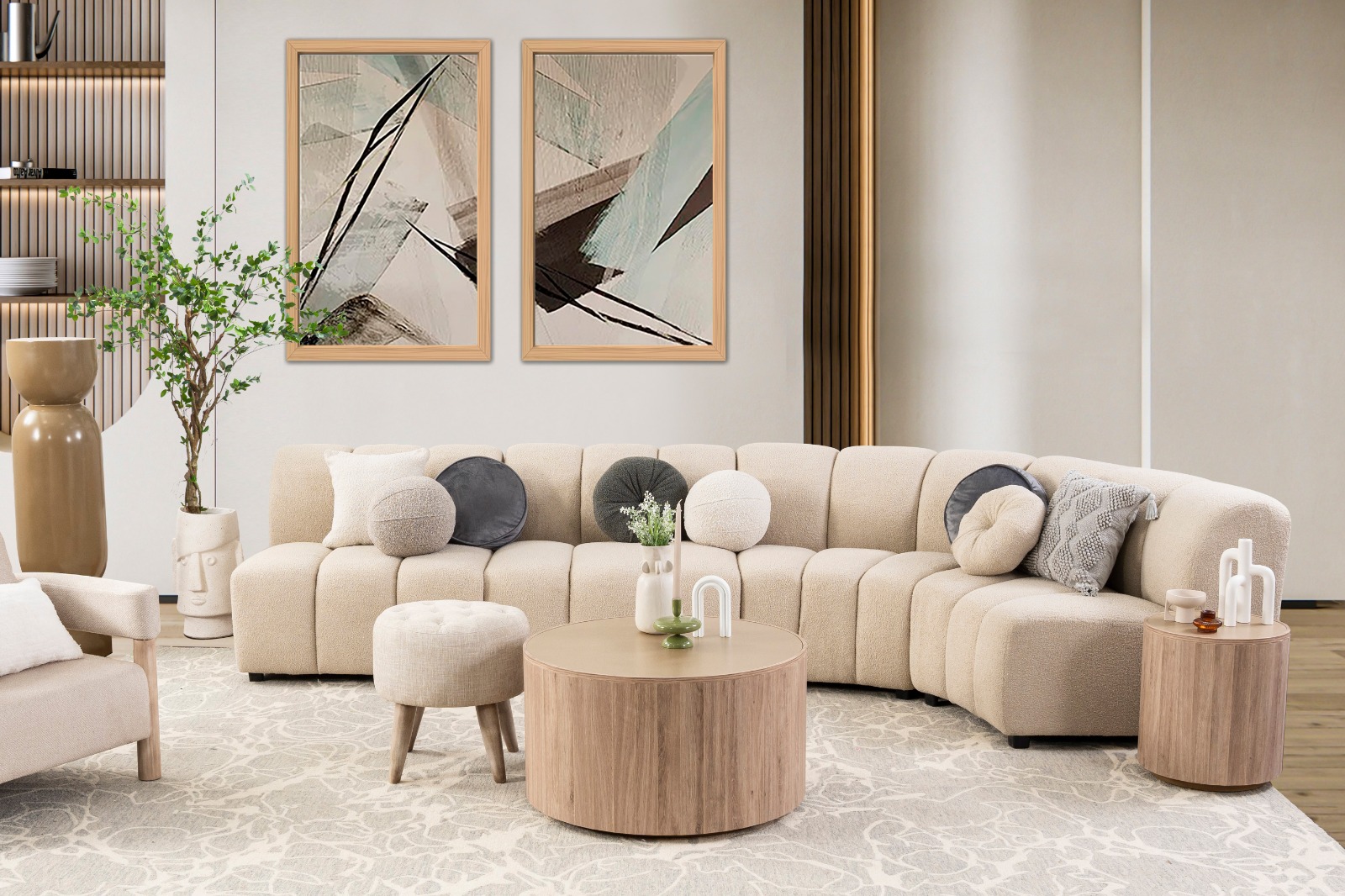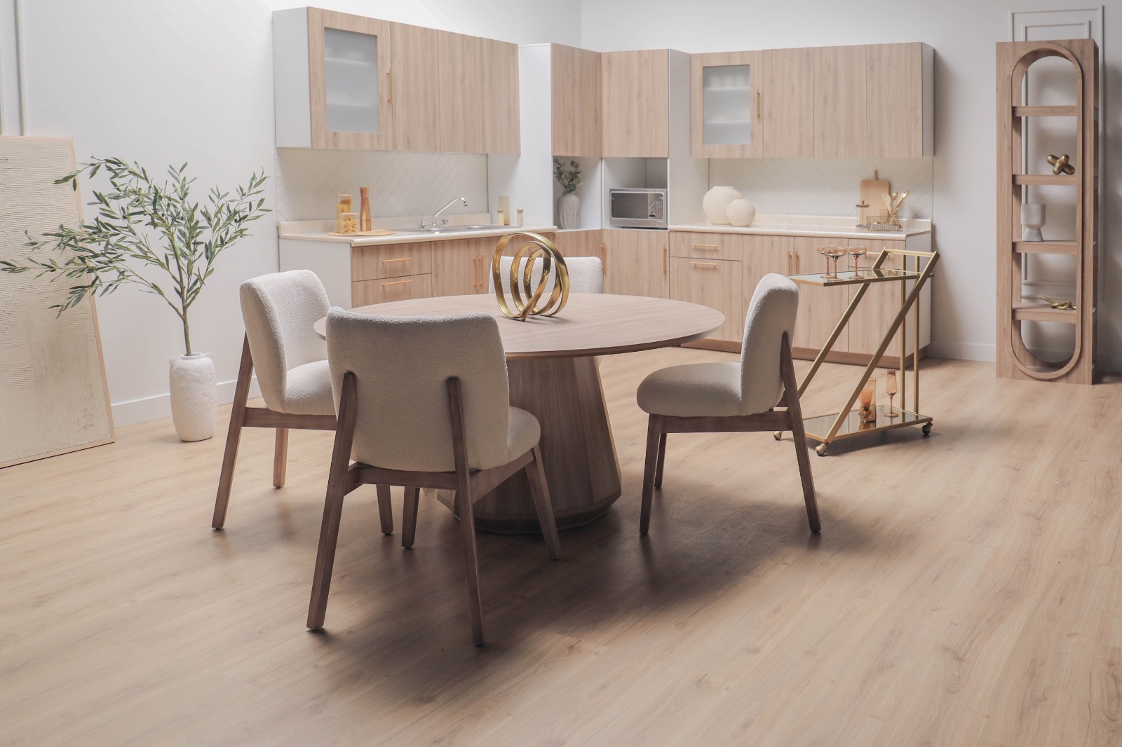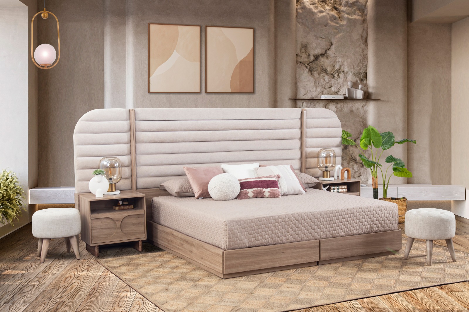 La colección cuenta, en una primera etapa, con más de 60 piezas, con las que se puede amueblar el hogar por completo. Entre los primeros muebles que destacan en la colección, hay una mesa de comedor circular de madera, una cama king size color beige con escultóricas patas plata, un aparador bajo con puertas con volumen geométrico, mesa de centro y laterales, fabricadas en madera industrializada, con acabado en tono marfil y cubierta con diseño de mármol, burós blancos con destellos dorados, una sala curva modular en colores suaves y tejidos cálidos, un carrito bar con puertas nacaradas e interiores revestidos de espejo. ¡Pero habrá mucho más!
