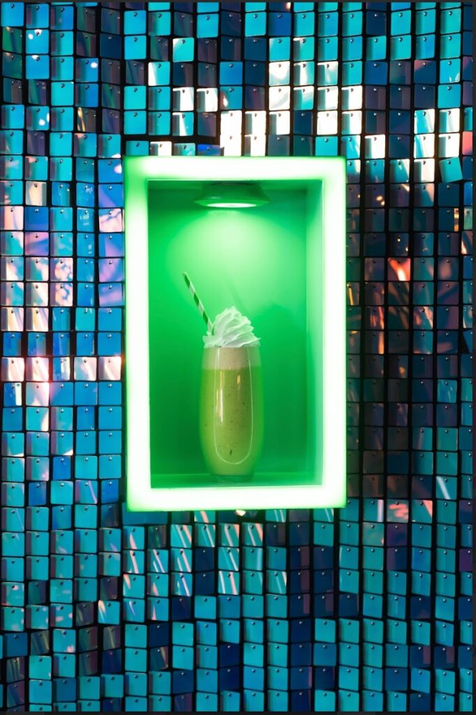 - Una vez cremosa y suave, se sirve en vaso rocks y se corona con crema batida y como plus chispas verdes.