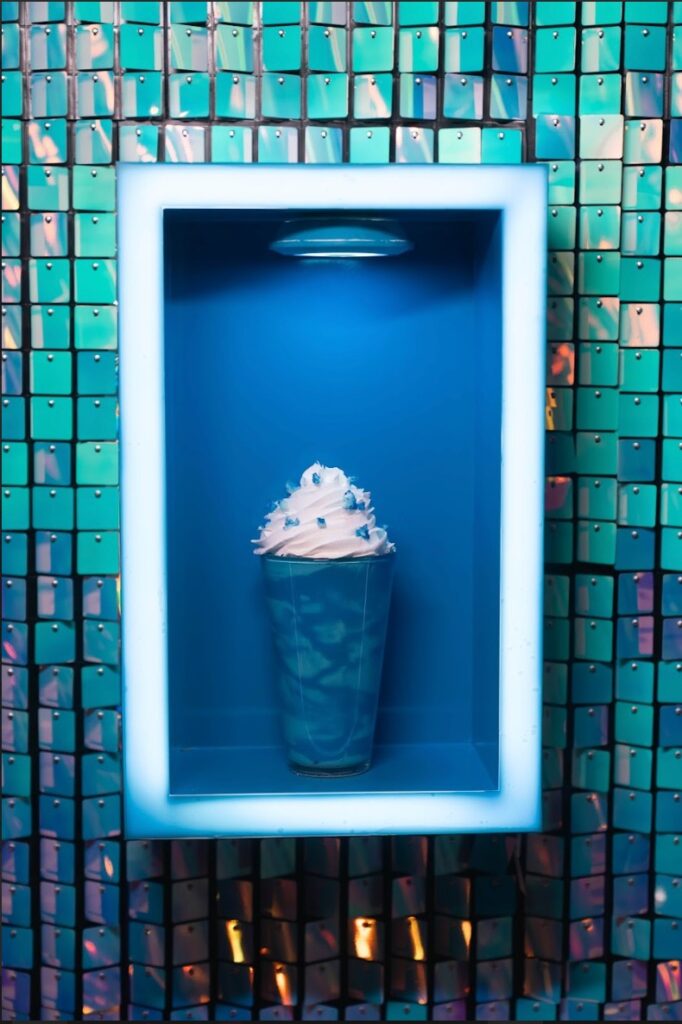 - Se licúan 60 ml de Baileys Chocolate, 90 ml de leche, 15 g de azúcar, hielos y 6 gotitas de colorante alimentario azul (porque aquí todo tiene solución).