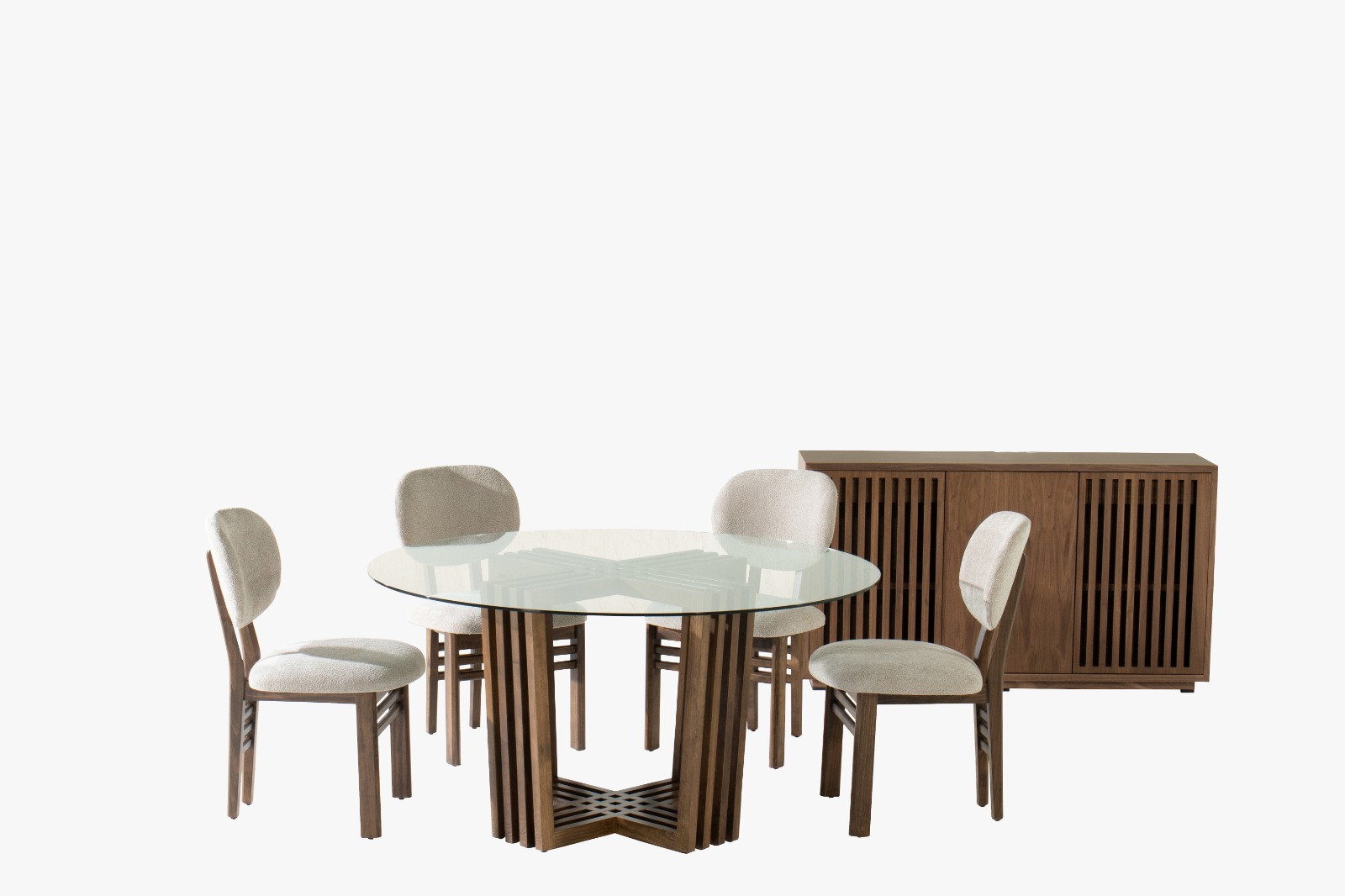 Claridad y transparencia: Uno de los materiales más destacados de esta temporada es el vidrio en diferentes aplicaciones y acabados, desde innovadores vidrios martillados y vidrios pigmentados, hasta el inesperado retorno del vidrio natural como elemento protagónico en los muebles. El uso de este tipo de materiales y acabados aporta una sensación de claridad, luminosidad, amplitud y transparencia a los espacios. Introduce mobiliario con cubiertas de vidrio que resalten las bases y pedestales más provocadores y sofisticados para brindar elegancia y modernidad a tu hogar. Comedor Firenze.