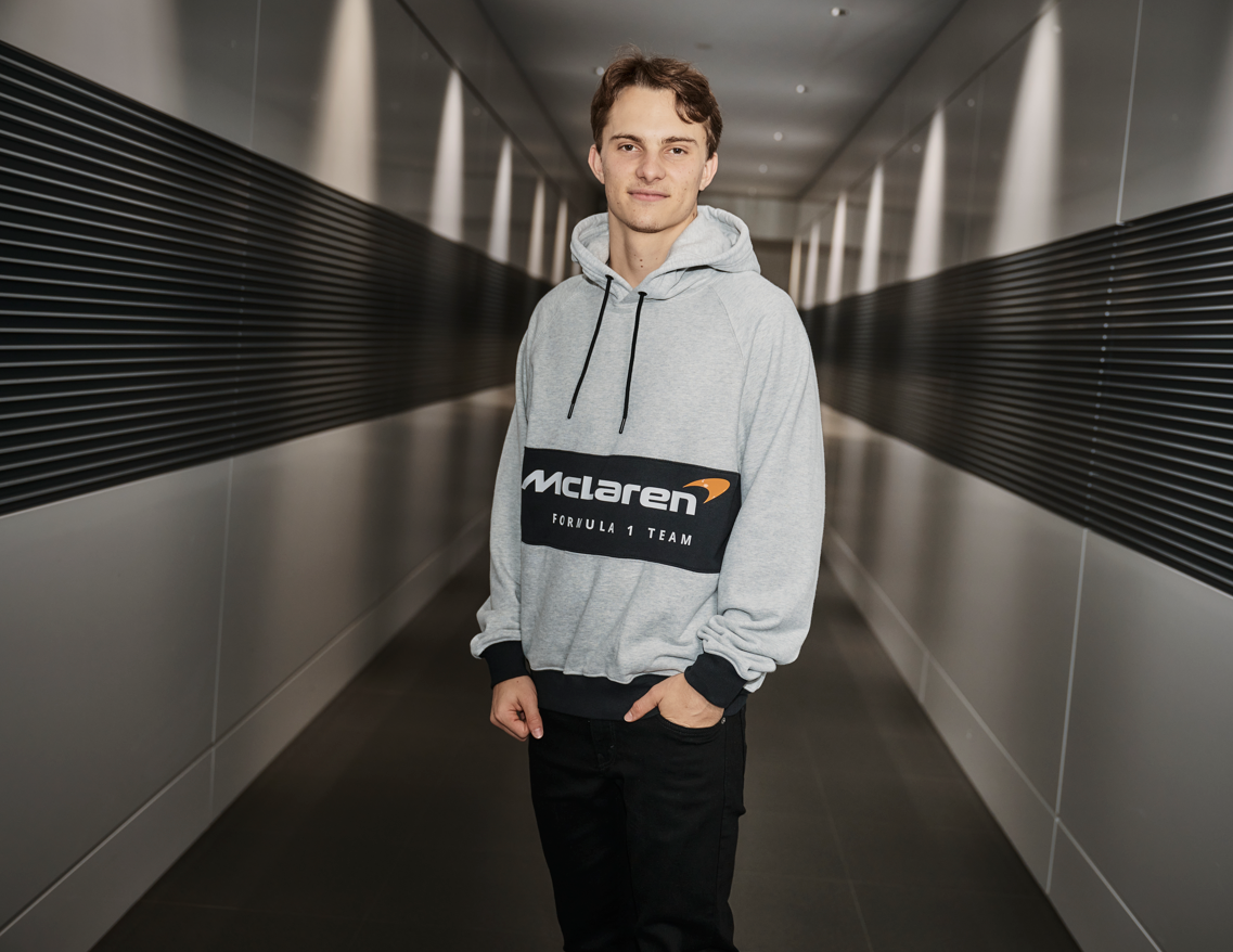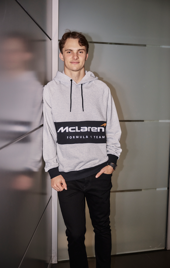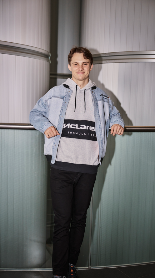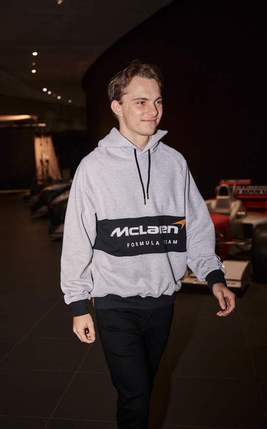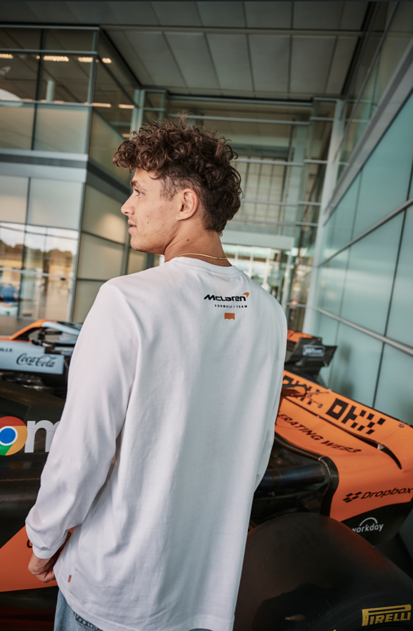 Second Skin, basado en los estampados modulares de McLaren Racing, ofrece un cuello alto de manga larga naranja con un acabado de alto brillo. La Constructors Tee, de ajuste holgado, presenta laureles conmemorando las victorias de McLaren Racing a lo largo de los años, las firmas de Bruce McLaren y Levi Strauss, y una etiqueta lateral. Con un cuerpo en bloque de color gris jaspeado, un panel de felpa negra y mangas raglán, la Fleece Hoodie utiliza la misma técnica de impresión de silicona brillante que Second Skin para un acabado brillante. Viene con una etiqueta personalizada «L» y un gráfico en la espalda.